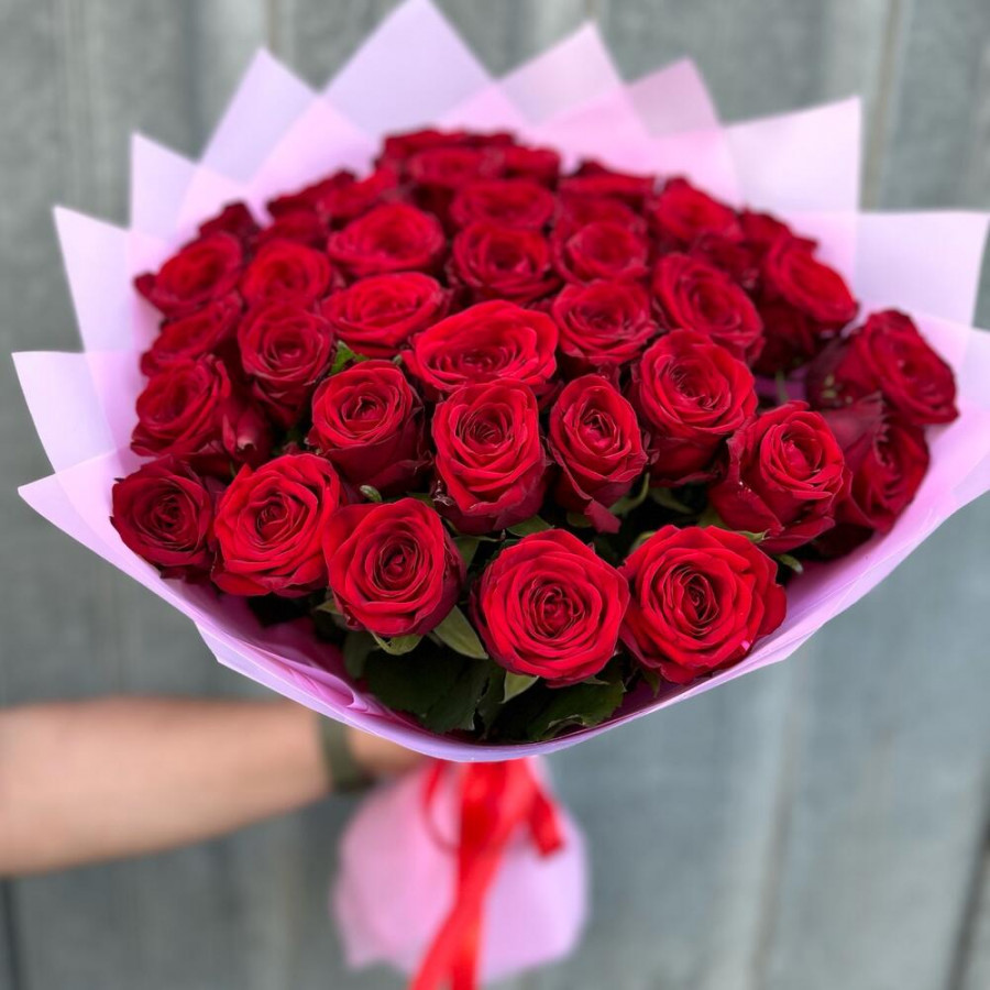 На фото букет из 41 красной розы. В составе: роза 41 шт, дизайнерская упаковка 2 шт, атласная лента 1 шт, . Все цветы свежие и ароматные, букет красиво оформлен и отлично подходит для подарка. Доступна доставка цветов или самовывоз.
