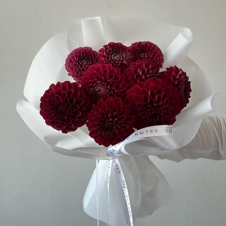 На фото букет из 9 бордовых георгин. В составе: георгина 9 шт, дизайнерская упаковка 2 шт, атласная лента 1 шт, . Все цветы свежие и ароматные, букет красиво оформлен и отлично подходит для подарка. Доступна доставка цветов или самовывоз.