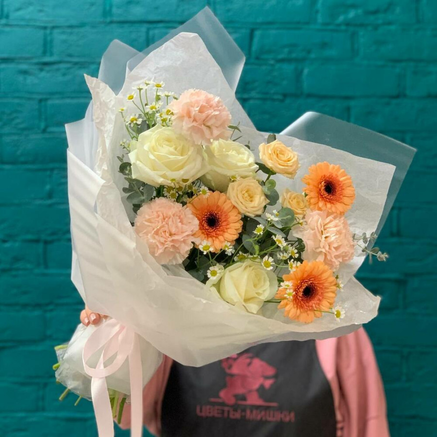 На фото букет «абрикосовый рассвет». В составе: роза 3 шт, кустовая роза 1 шт, гвоздика 3 шт, танацетум 3 шт, гербера 3 шт, писташ 2 шт, дизайнерская упаковка 1 шт, атласная лента 1 шт, . Все цветы свежие и ароматные, букет красиво оформлен и отлично подходит для подарка. Доступна доставка цветов или самовывоз.